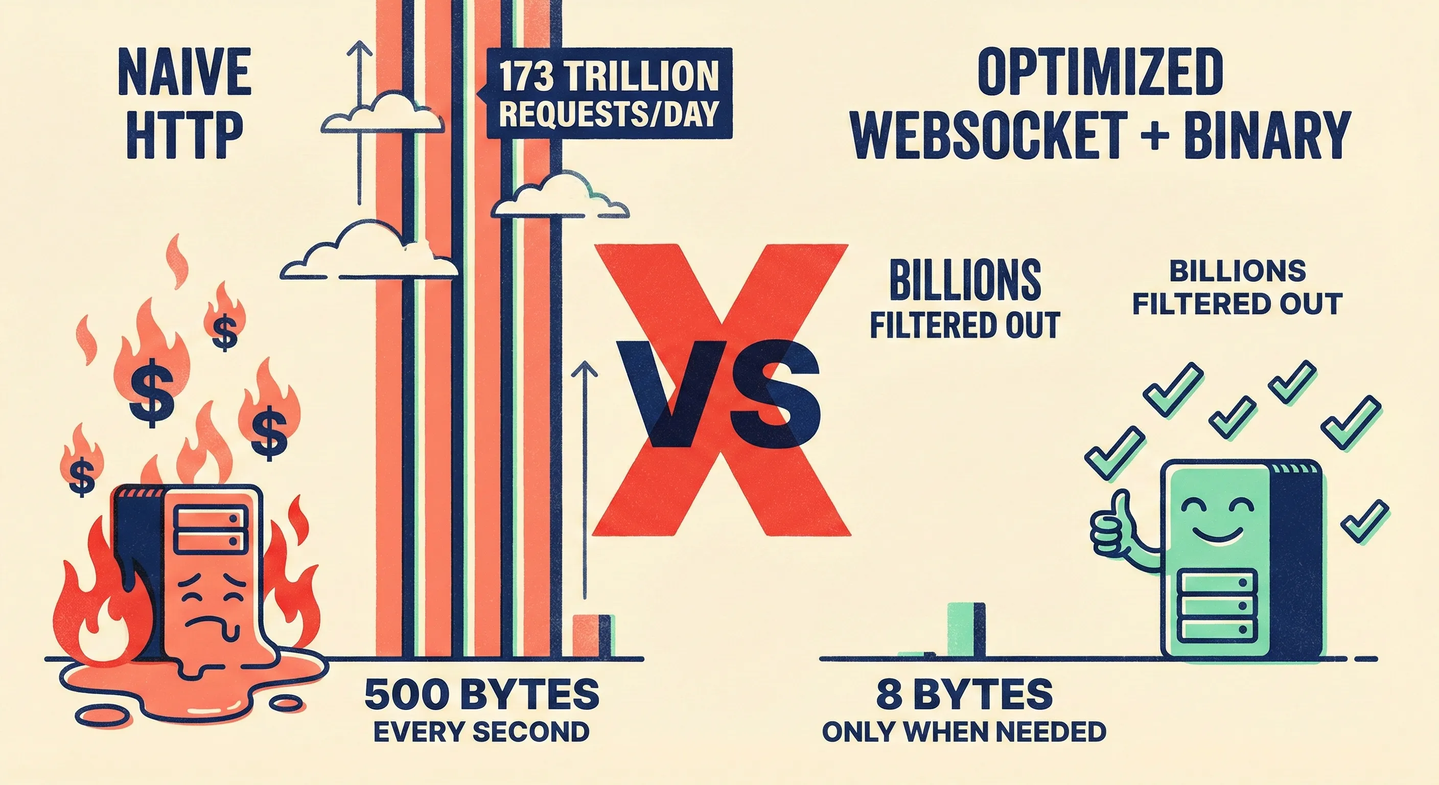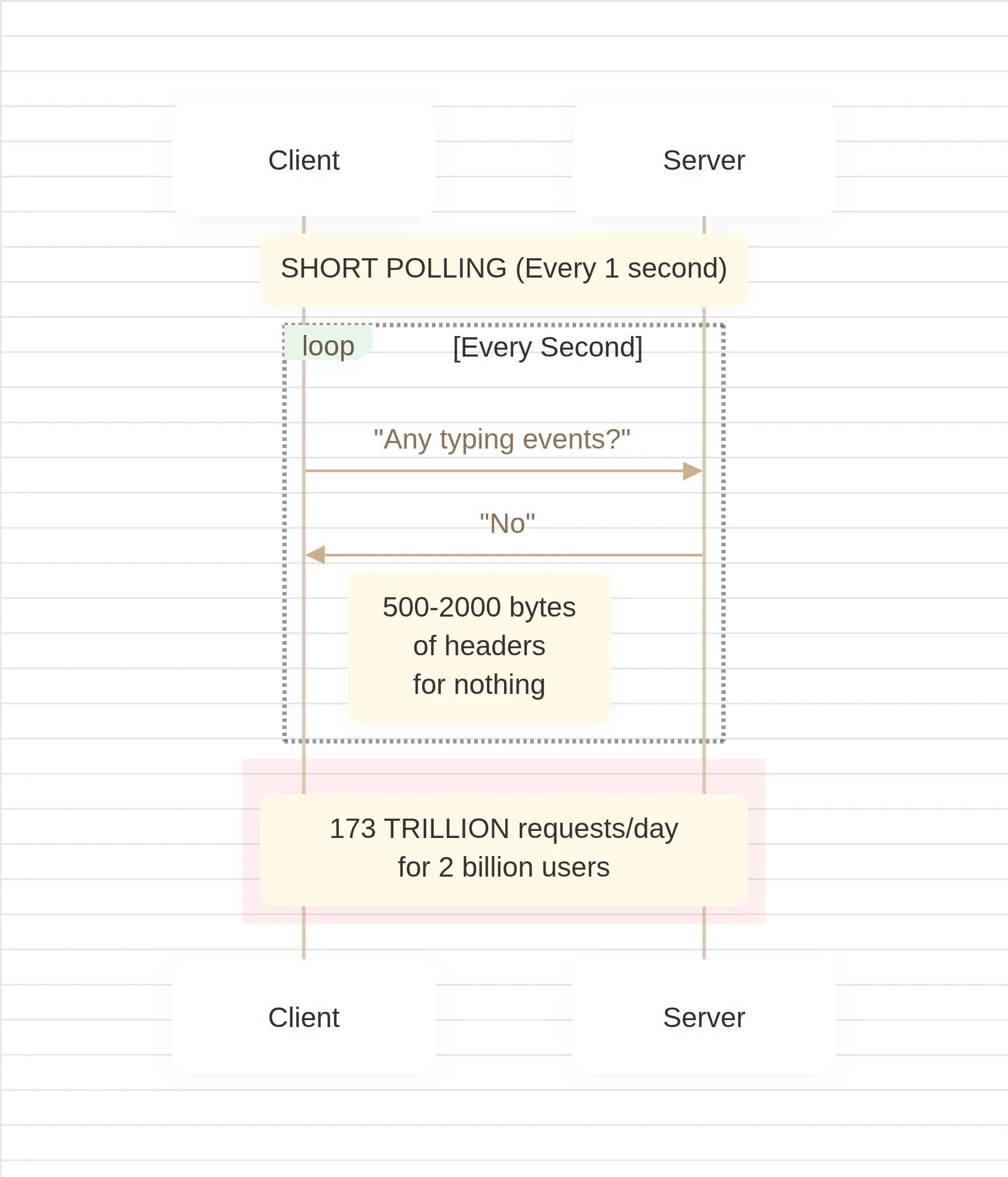 Consider the math: If WhatsApp’s 2+ billion users polled every second for typing status, that’s 173 trillion requests daily just for ephemeral UI indicators. Each HTTP request carries 500-2000 bytes of headers alone. You’re burning bandwidth on empty packets asking about nothing.