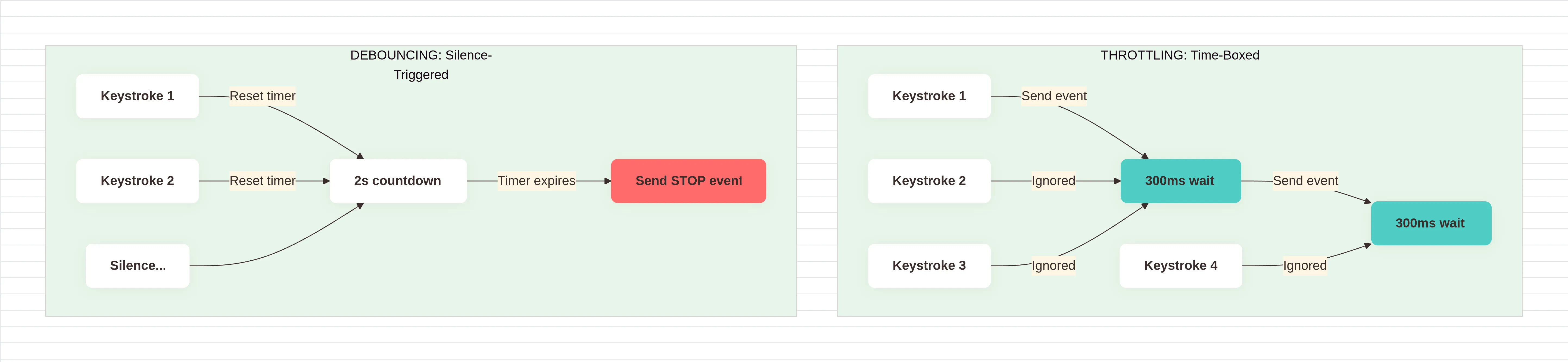 The combination is surgical: Throttling manages active typing traffic, while debouncing handles the transition to idle. Together, they compress billions of potential events into manageable, predictable traffic patterns.