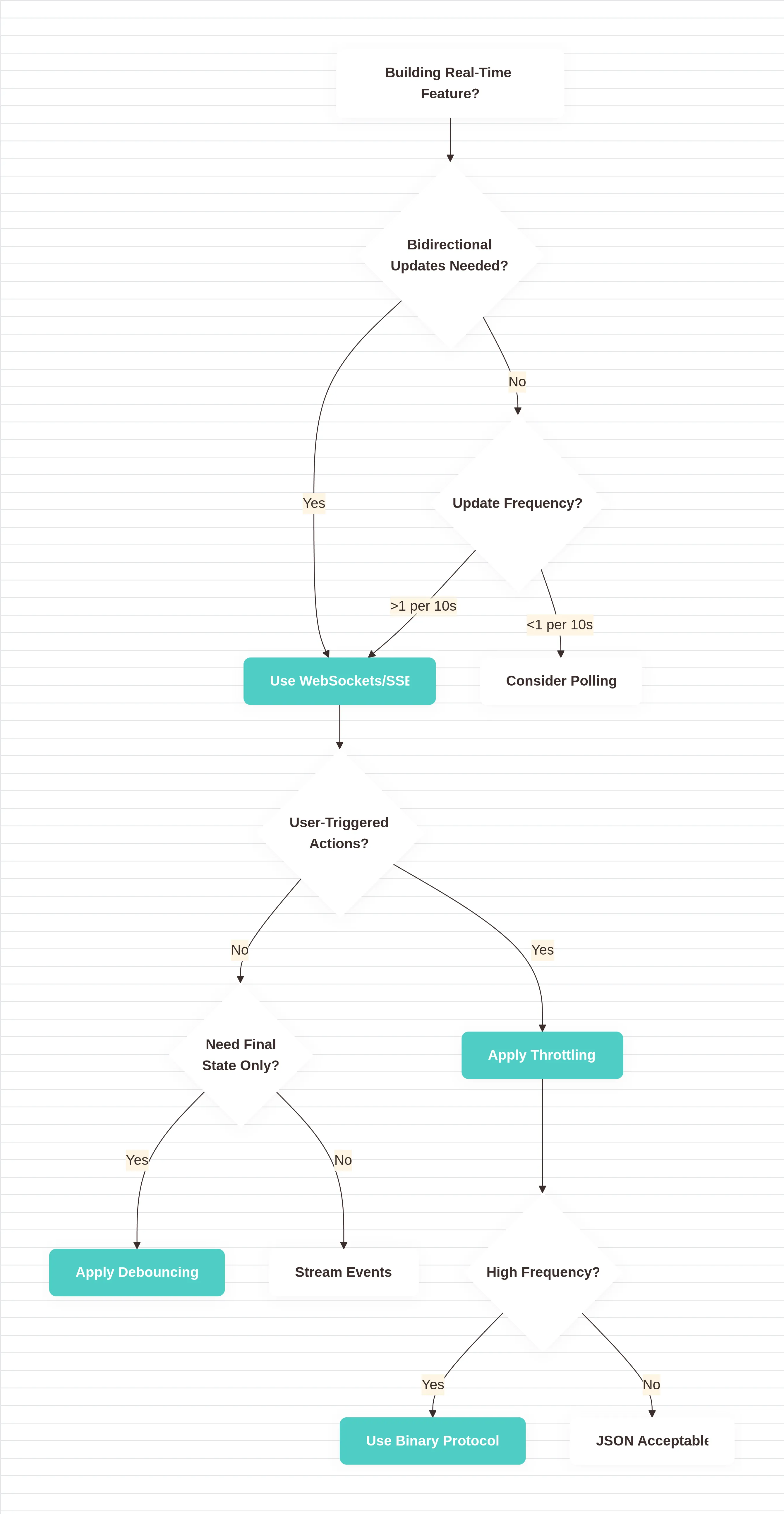 Never send JSON over WebSockets for high-frequency events. Use binary protocols (MessagePack, Protocol Buffers, or raw binary frames). The overhead difference between 500 bytes of JSON and 10 bytes of binary is the difference between scaling to millions and collapsing at thousands.