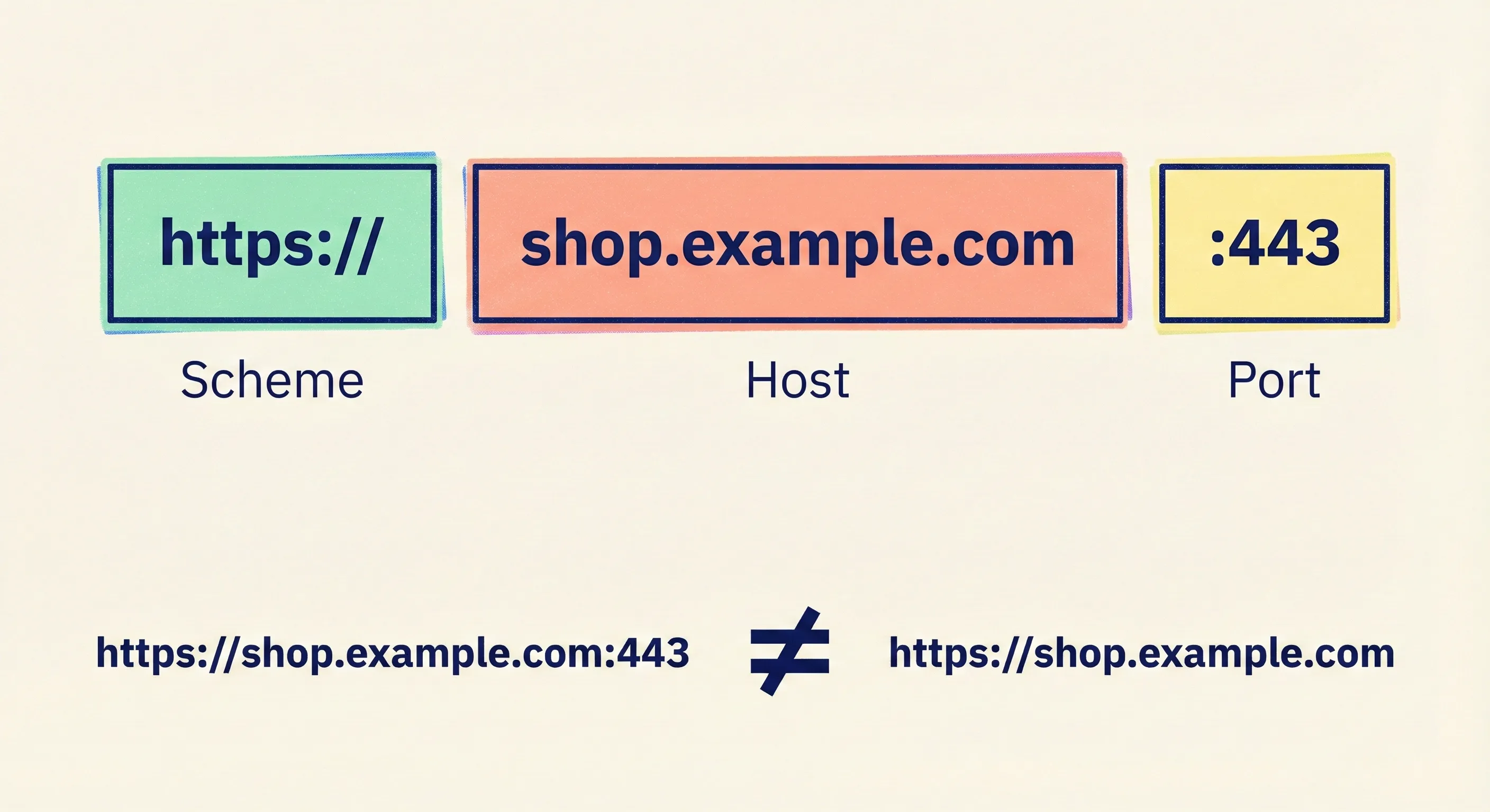 Origin = scheme + host + portNo normalisation, no sub-domain inheritance, no “https is close enough”. https://shop.example.com:443 is different from https://shop.example.com because the port is explicit in the first.