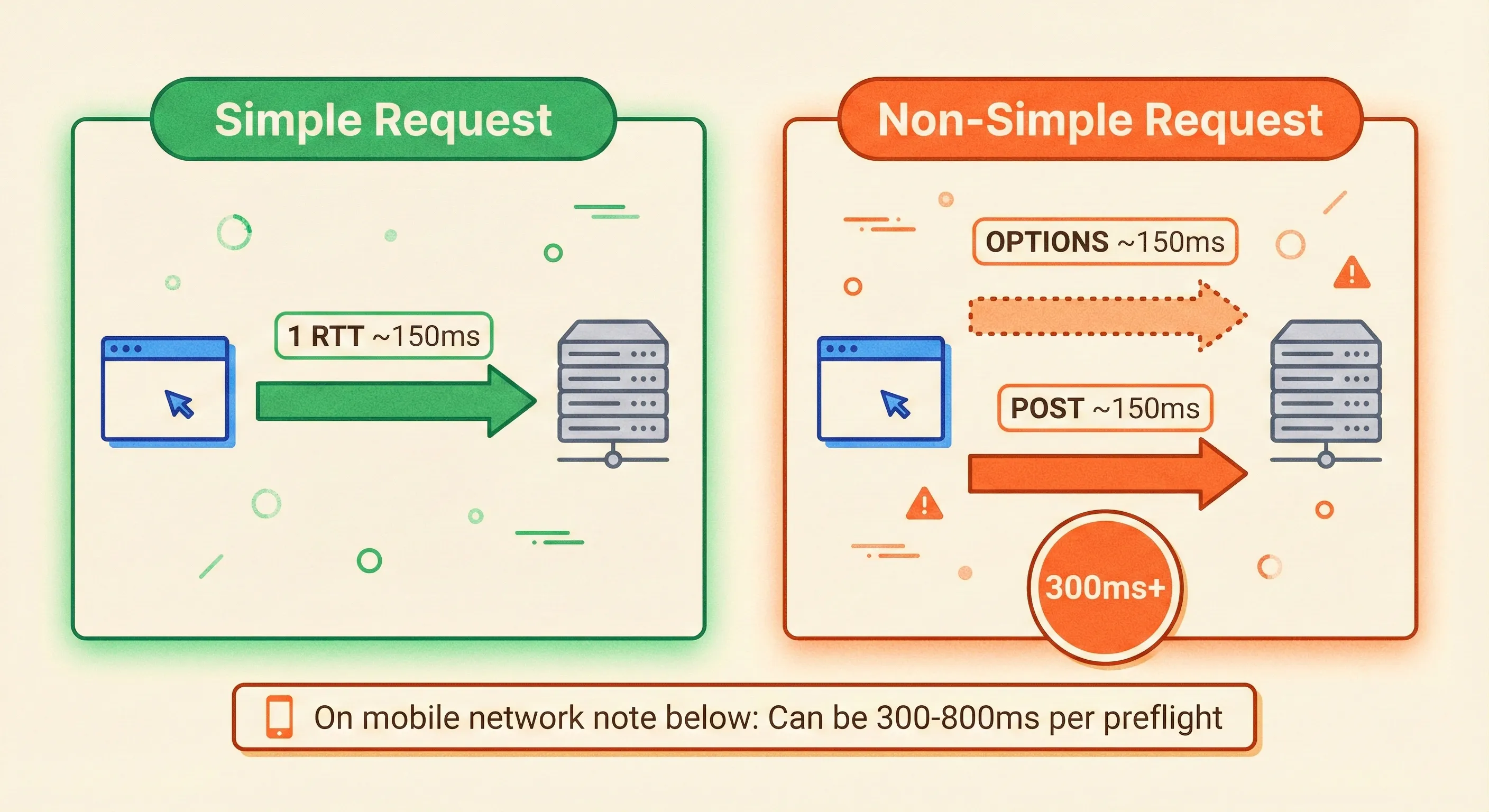 - One extra hop for every non-simple request. On mobile networks that can be 300–800 ms.
