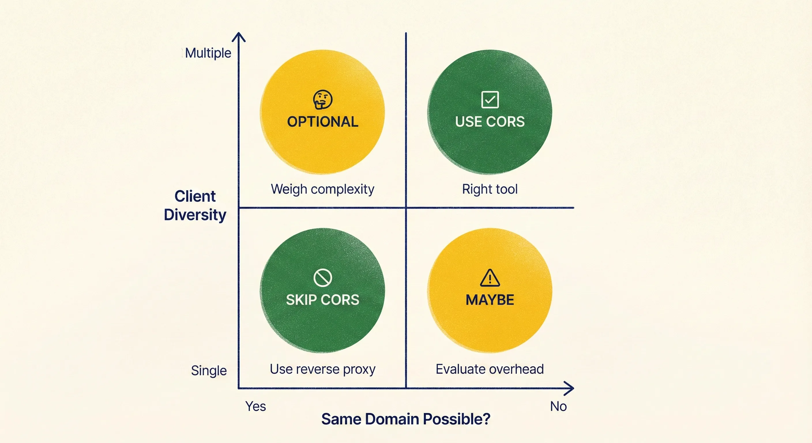 - You control both ends and could run them under the same registrable domain—use a reverse proxy and avoid CORS entirely.