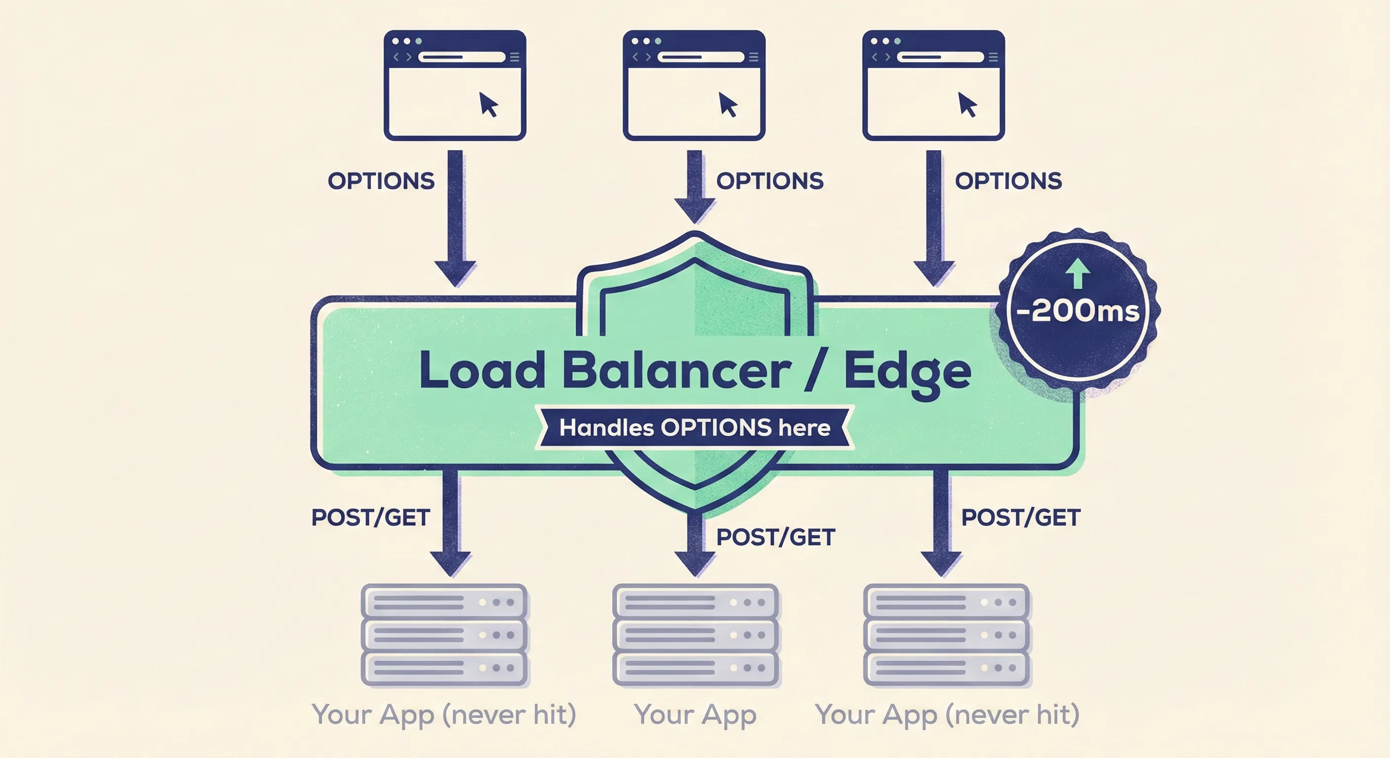 - Preflight is an edge concern; handle it in the outermost layer and short-circuit so your business middleware stack never spins up.