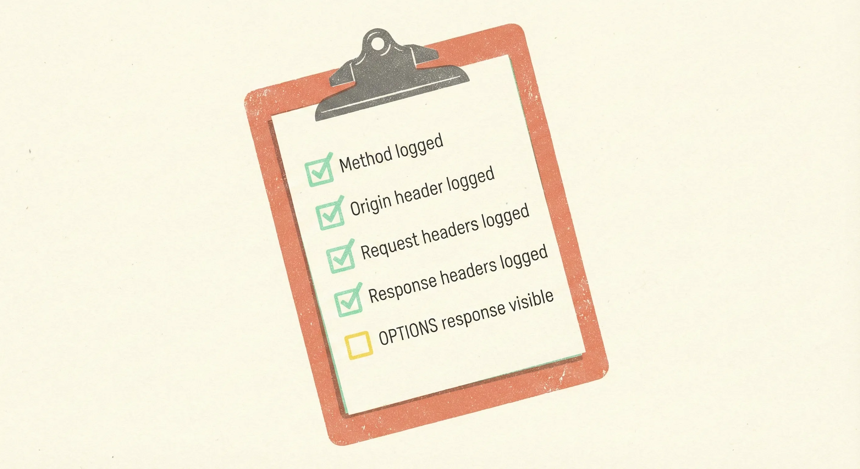 - Most loggers skip OPTIONS because it has no body. Log method, origin, request-headers, and response headers; they are the only evidence when a mobile release changes its fetch defaults.