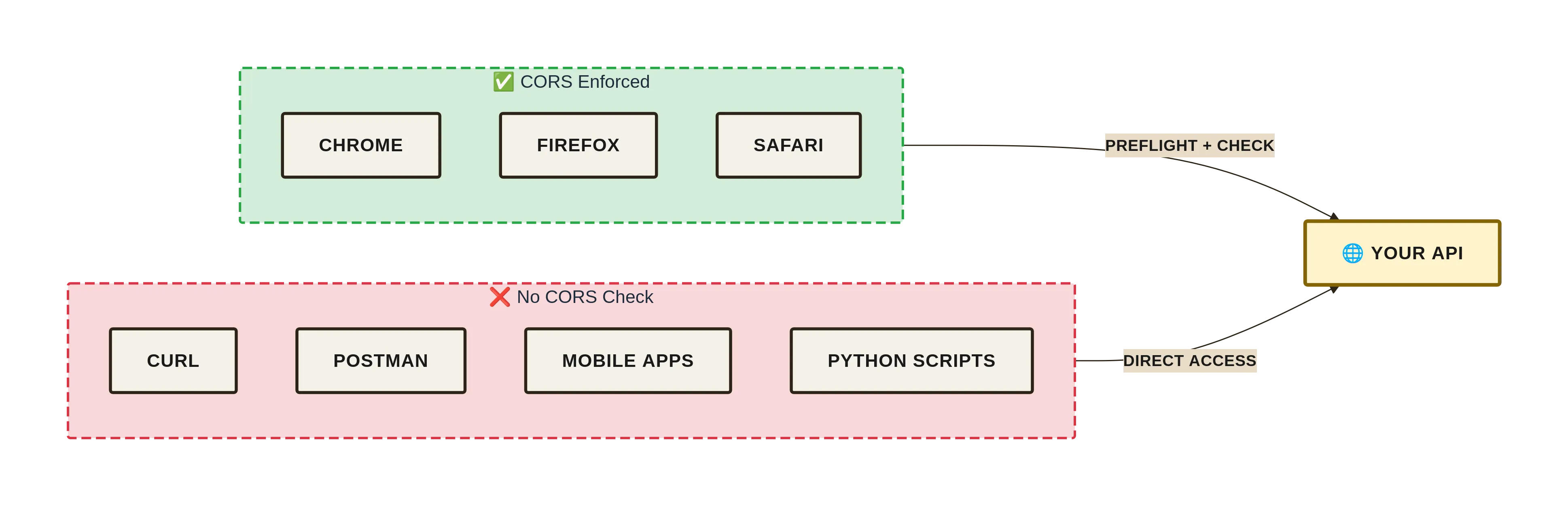 - CORS is enforced only by browsers. Curl, Postman, your mobile app, and the attacker’s python script never perform the preflight check.