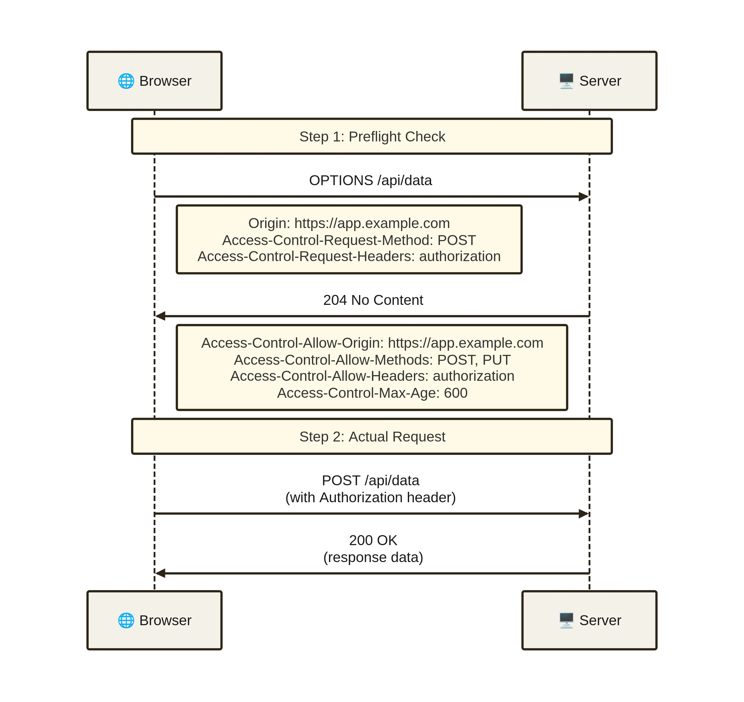 Browser → POST /api/data …If any header or method is absent from the server reply, the browser aborts before your application code runs. No fetch rejection handler will see the actual response body because the browser never exposes it.