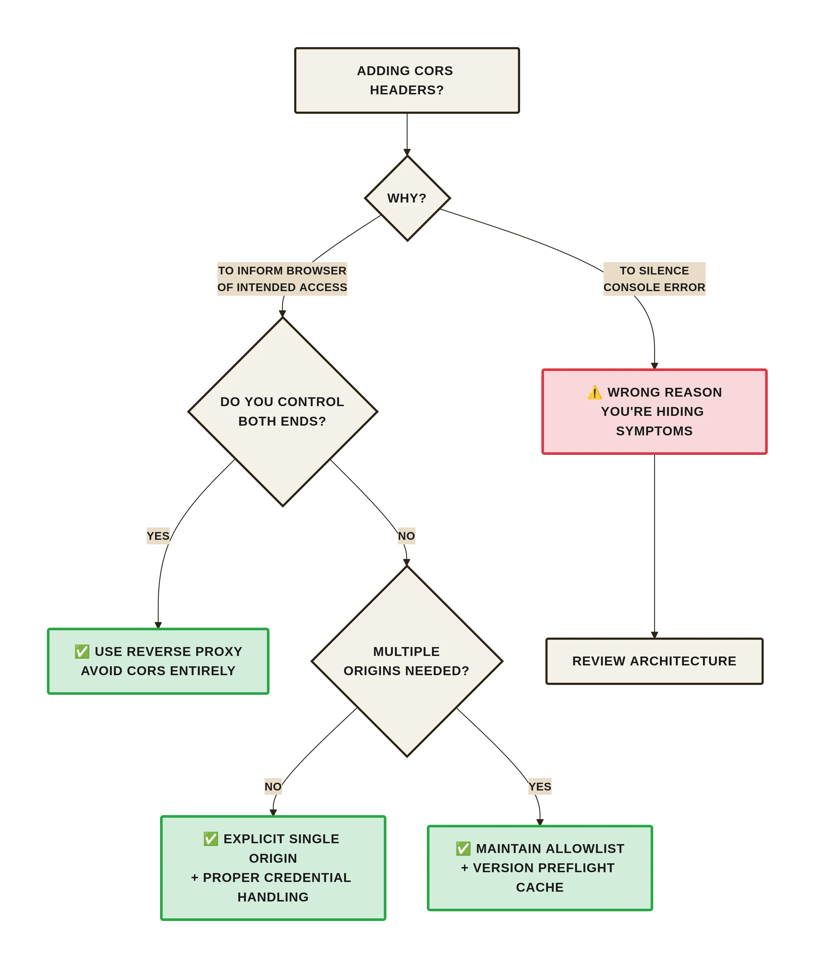 Access-Control-Allow-Originlike a firewall rule, not a string patch.- Keep an allowlist array in config, never hard-code.